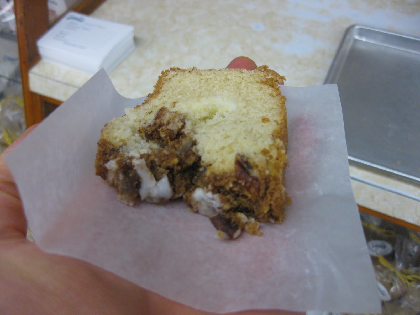 After browsing all the available choices I went with the obvious – two canolli, one with chocolate cream and chopped walnuts and the other with sweet ricotta, chocolate chips, and pistachio. Paying the modest $6 fee I watched the bakers fill the pastries before the store clerk boxed and tied them with a bow and presented me with a delectable sample of warm cinnamon coffee cake from the kitchen.