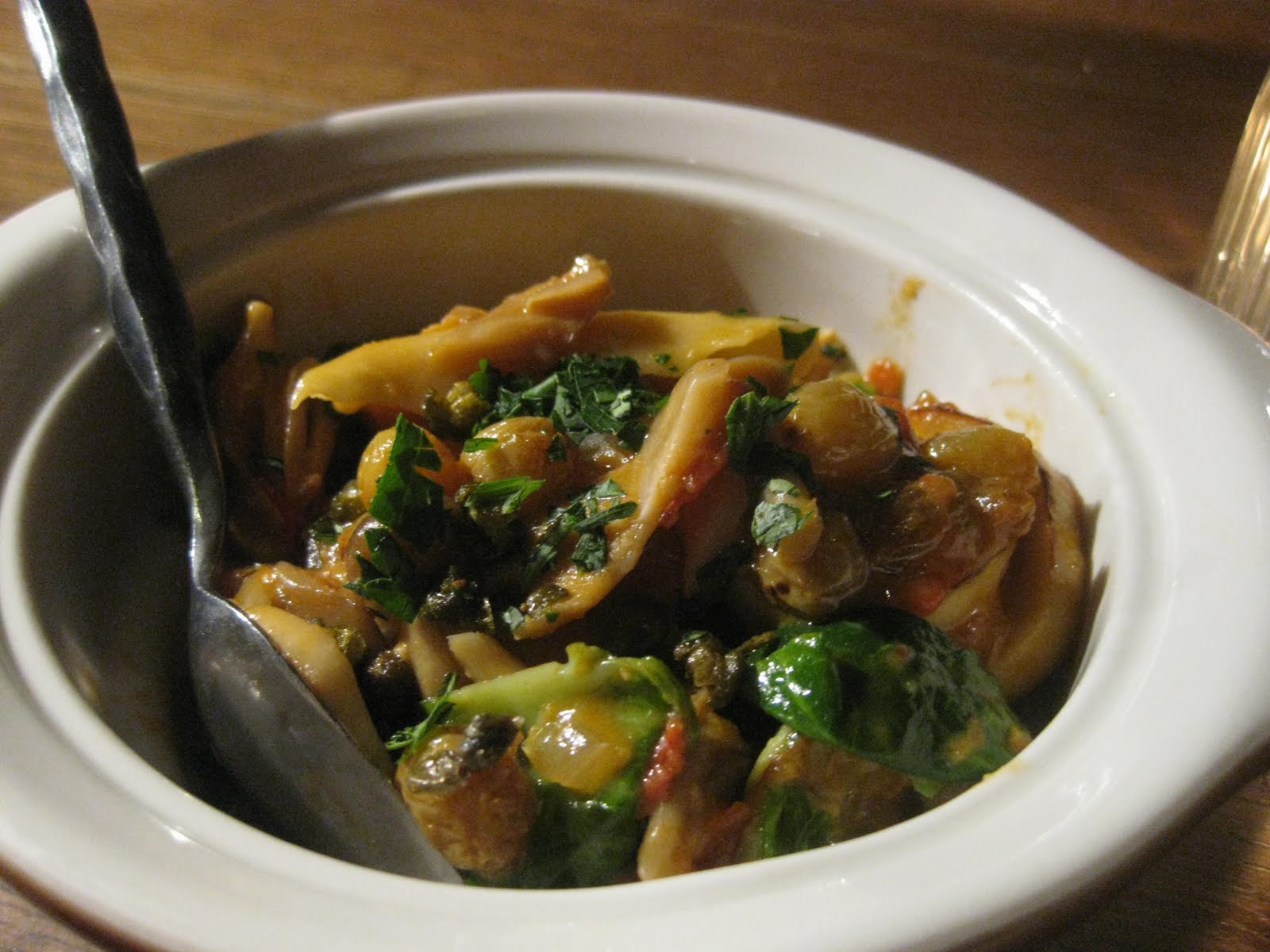 The second course to arrive, as I was enjoying the bread and chatting with the chefs, would be Kabocha Squash Ravioli with Mushroom Raisin Ragout, Brussels leaves, Shroom Crème Fraiche. Having asked my server about portion sizes to avoid large plates this dish was significantly larger than billed – seven Raviolis compared to the four promised – and each was delectable, perfectly cooked, and stuffed to near bursting with a nutty but sweet puree of squash. Complimenting the raviolis was a light and earthy whipped sauce, pungent Brussels sprouts, and fibrous mushrooms intermingling with golden raisins. Never one to complain about more food if it is good I have no complaints at all.